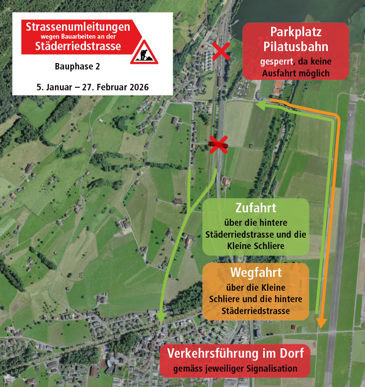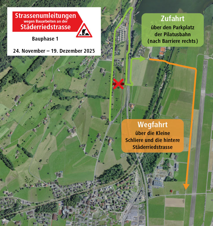 - Der Parkplatz der Pilatusbahn kann wieder normal benutzt werden, die Ausfahrt führt wie gewöhnlich unter der Unterführung der zentralbahn bis zur Brünigstrasse.