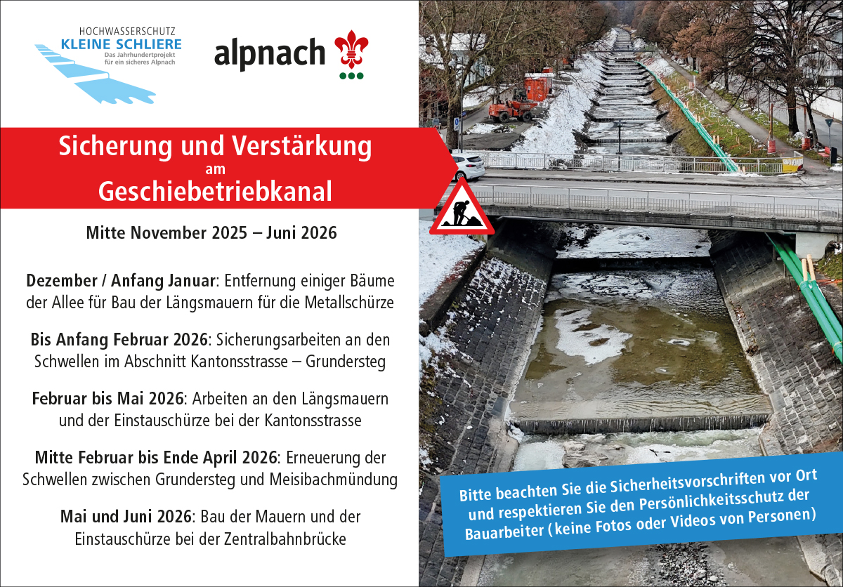 In mehreren Etappen werden bis Mitte 2026 im Geschiebetriebkanal die Schwellen verstärkt/erneuert und Mauern/Schürzen bei den Brücken gebaut, um die Hochwassersicherheit in Alpnach weiter zu erhöhen: