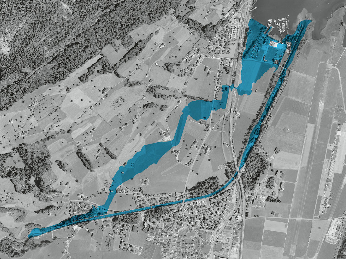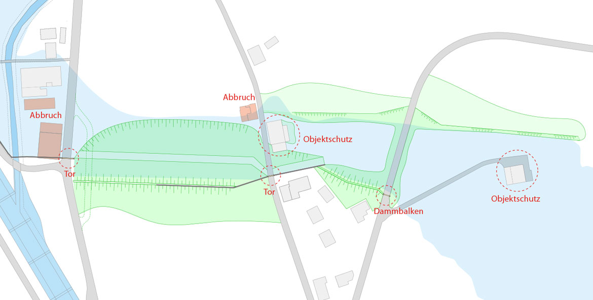 Die eingezeichnete Fläche des Entlastungskorridors wird bei einem Extremereignis nicht total überschwemmt. Das Bild zeigt lediglich das Gebiet, das als Überschwemmungsgebiet vorgesehen ist.