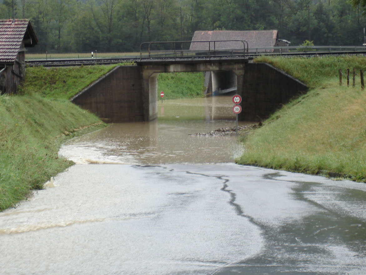 Das Wasser im Entlastungskorridor fliesst natürlicherweise durch diese zwei Unterführungen der Städerriedstrasse unter dem Bahntrassee der Zentralbahn und der Autobahn A8 hindurch (Bild vom Unwetter 2005). Die Strasse wird abgesenkt und die Strassenborde werden verstärkt. Anschliessend verteilt sich das Wasser auf der gesamten Breite und fliesst in Richtung Alpnachersee.