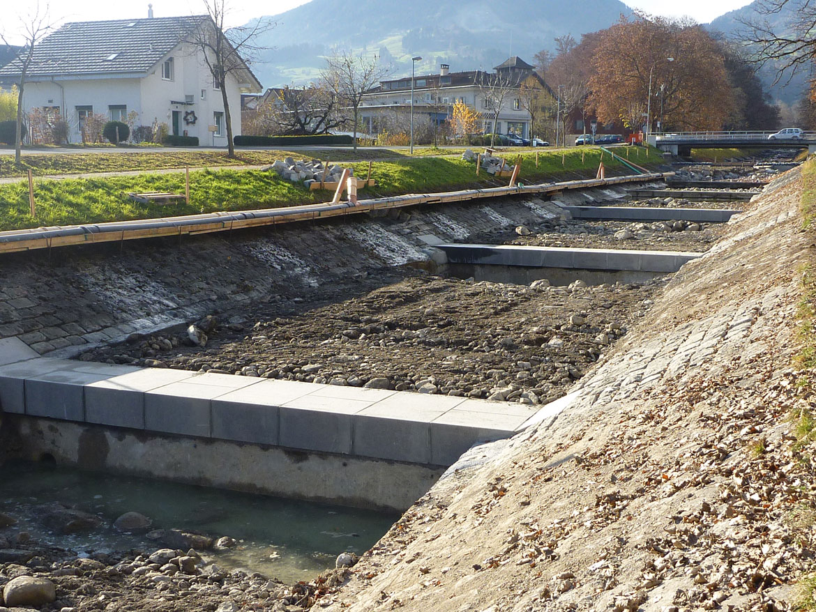 Unterhalb der Brücke über die Kantonsstrasse wurden die Schwellen bereits in den Jahren 2011 bis 2013 erneuert. Sie müssen nicht mehr verstärkt werden. Es braucht daran aber Anpassungen zur Erreichung der Fischdurchgängigkeit.