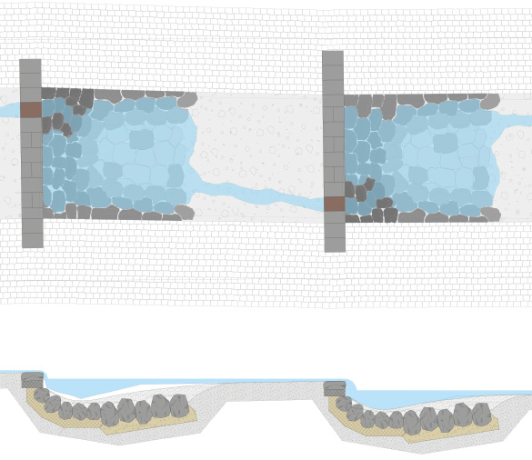 Phase 1: Das Bachbett unter den Schwellen wird während eines Ereignisses durch die Energie des Wassers ausgeschwemmt.