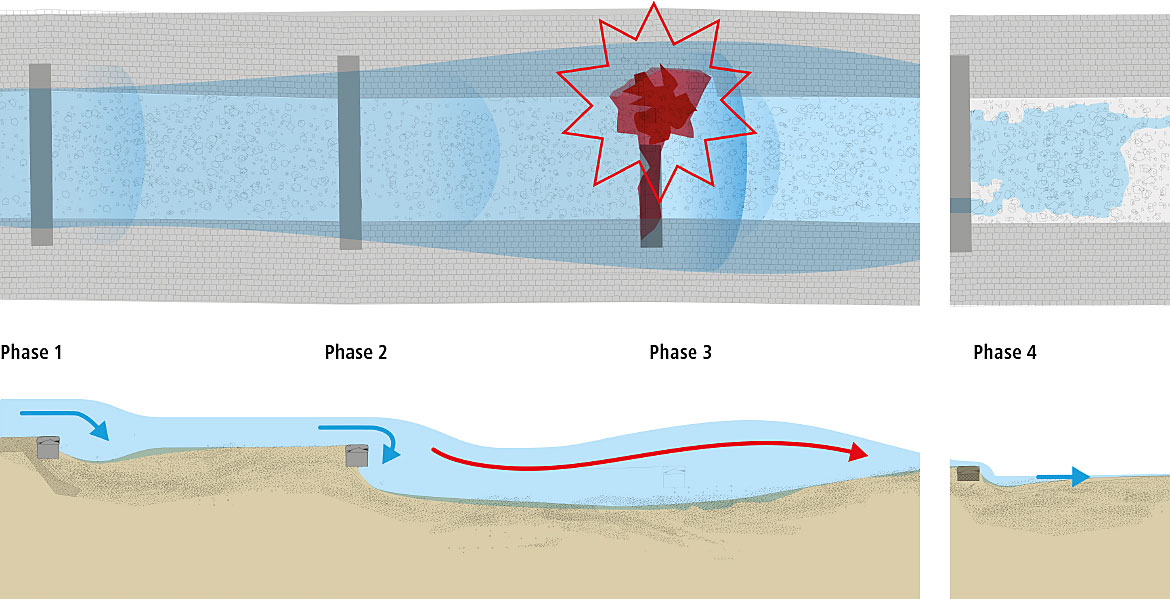 Phase 2: In der Folge unterspülen die Wassermassen die Schwellen und die Uferverbauungen. Diese können einer längeren Belastung nicht standhalten.