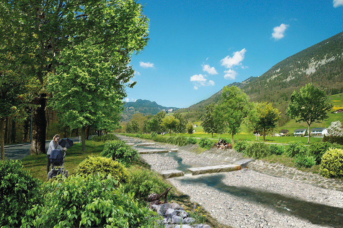 Im obersten Drittel oberhalb der Mündung des Meisibachs werden die Abstürze eliminiert und das Gerinne wird als Raubett gestaltet, damit sich keine Schwallwellen mehr bilden können.